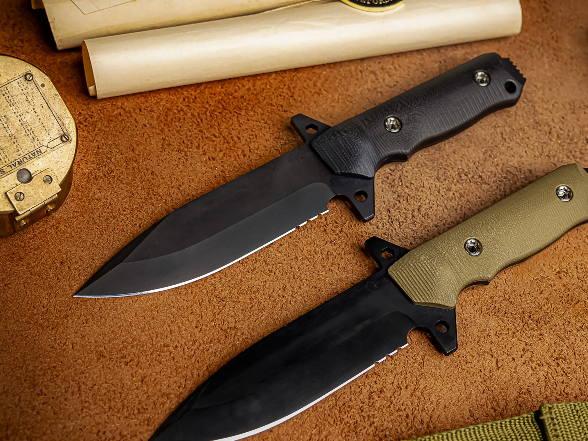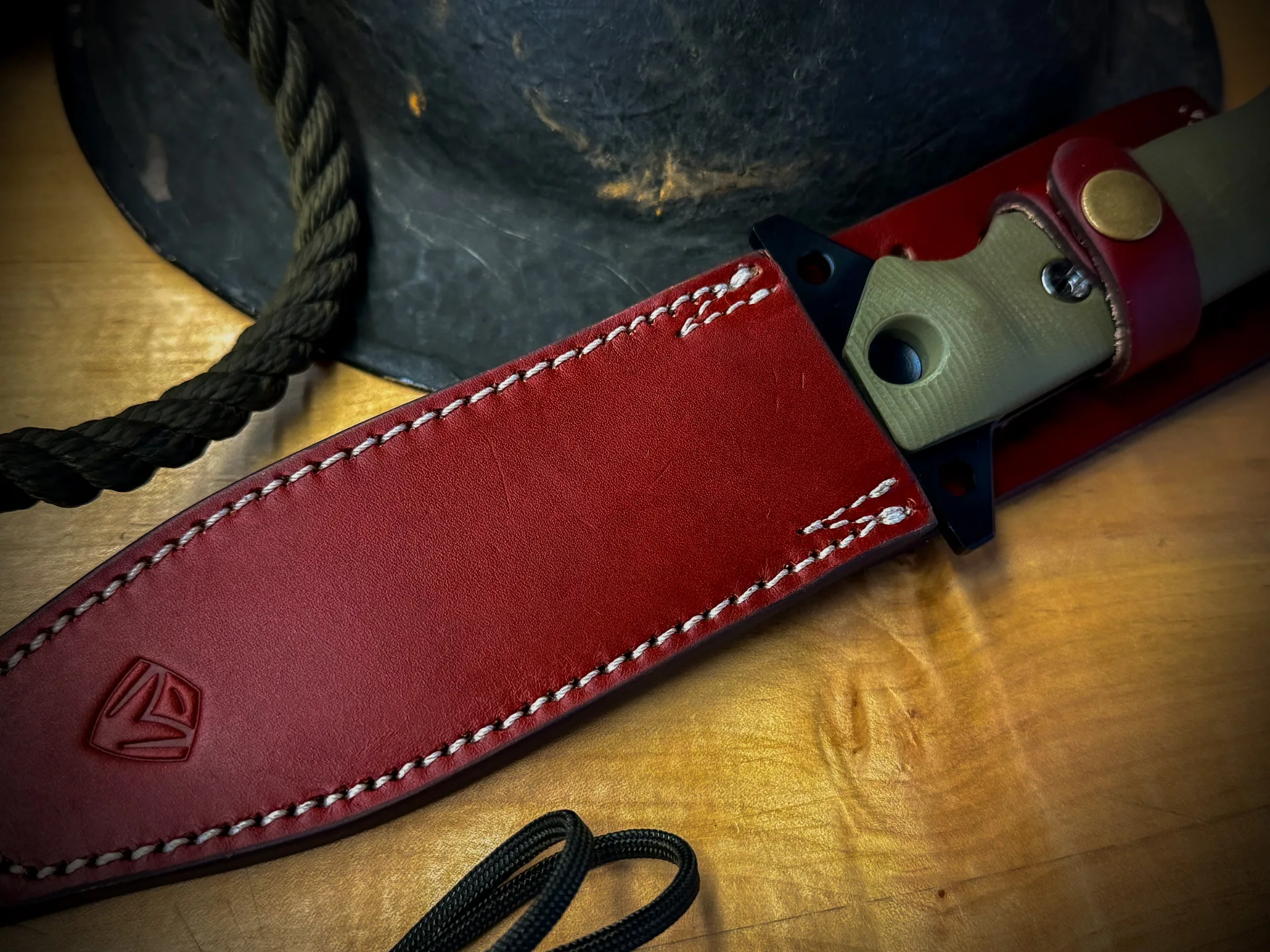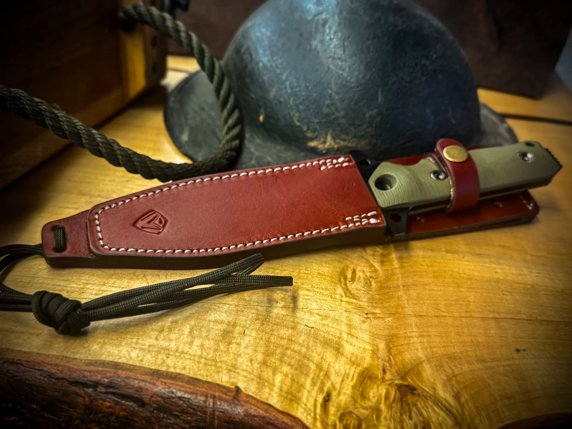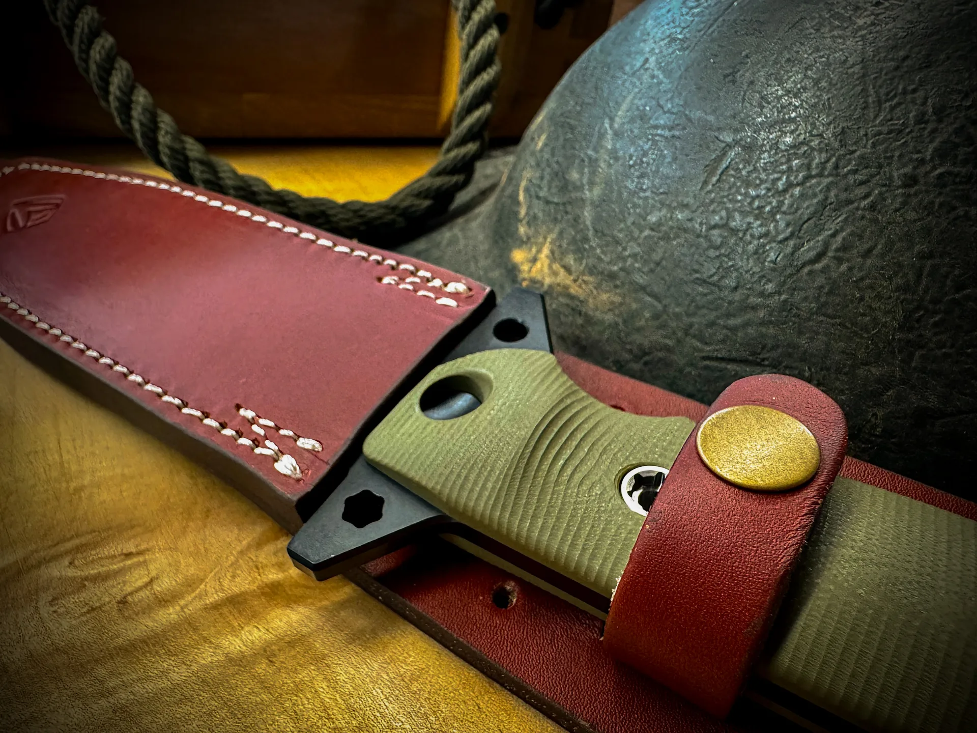 Adapt, Improvise and Overcome…mantras of school-house cadre Marine Corps wide. This knife was developed off a crayon sketch handed to Greg by a dear friend and Force Reconnaissance Marine. The knife is reissued in 2024 with a more modern geometry and been dehorned for a more human friendly carry. The blade is not serrated but “dull-notched” for lashing w paracord and better securing the blade for improvised spear strength, the fire starting divot for typical left hand holding and the crowbar has been replaced by a grooved pommel for hard striking. The AIO II mounts in an American Made top grain leather premium quality sheath in a drop style for belt or harness carry.